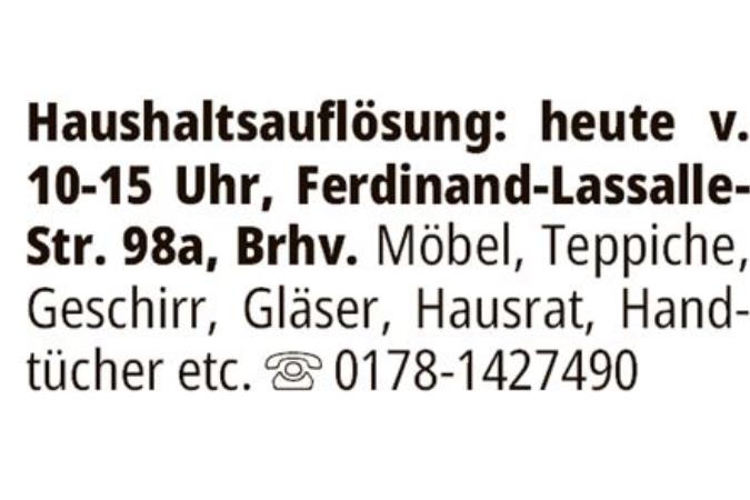 Haushaltsauflösung: heute v. 10-15 Uhr, Ferdinand-Lassalle-Str. 98a, Brhv. Möbel, Teppiche, Geschirr, Gläser, Hausrat, Handtücher etc. 0178-1427490
