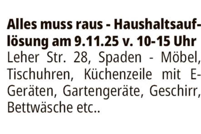 Alles muss raus - Haushaltsauflösung am 9.11.25 v. 10-15 Uhr Leher Str. 28, Spaden - Möbel, Tischuhren, Küchenzeile mit E-Geräten, Gartengeräte, Geschirr, Bettwäsche etc..